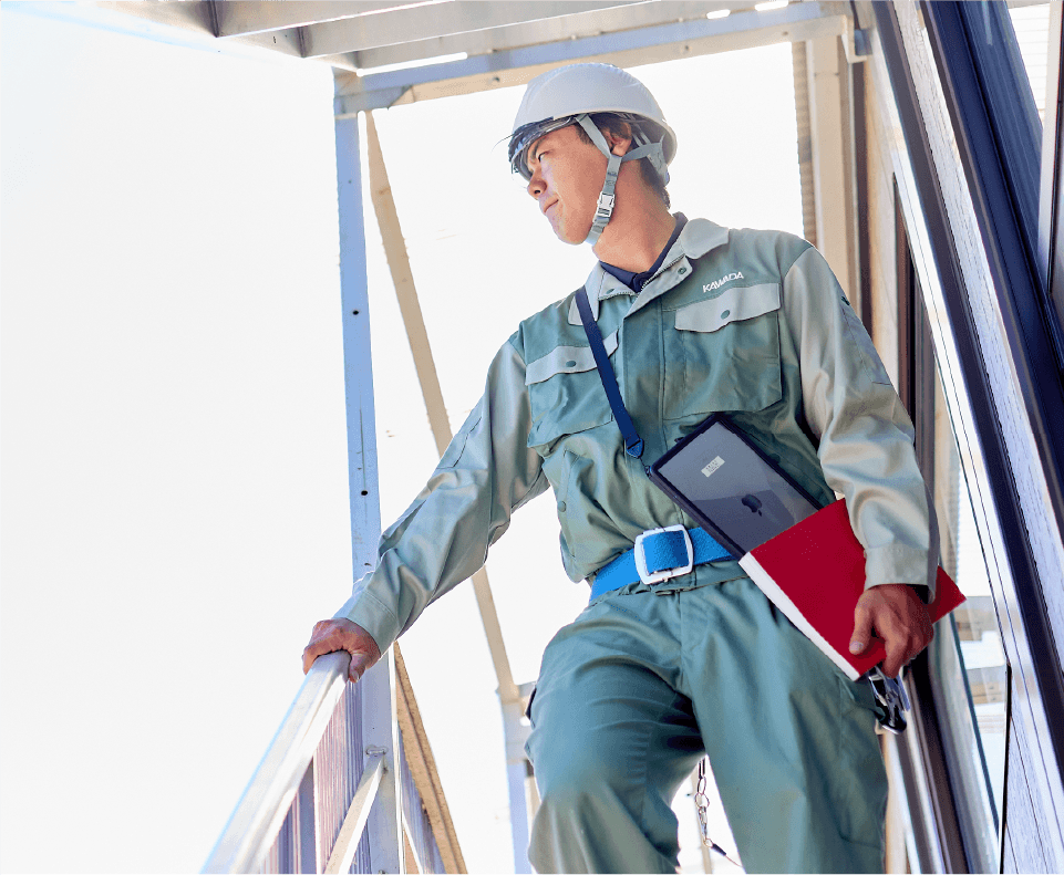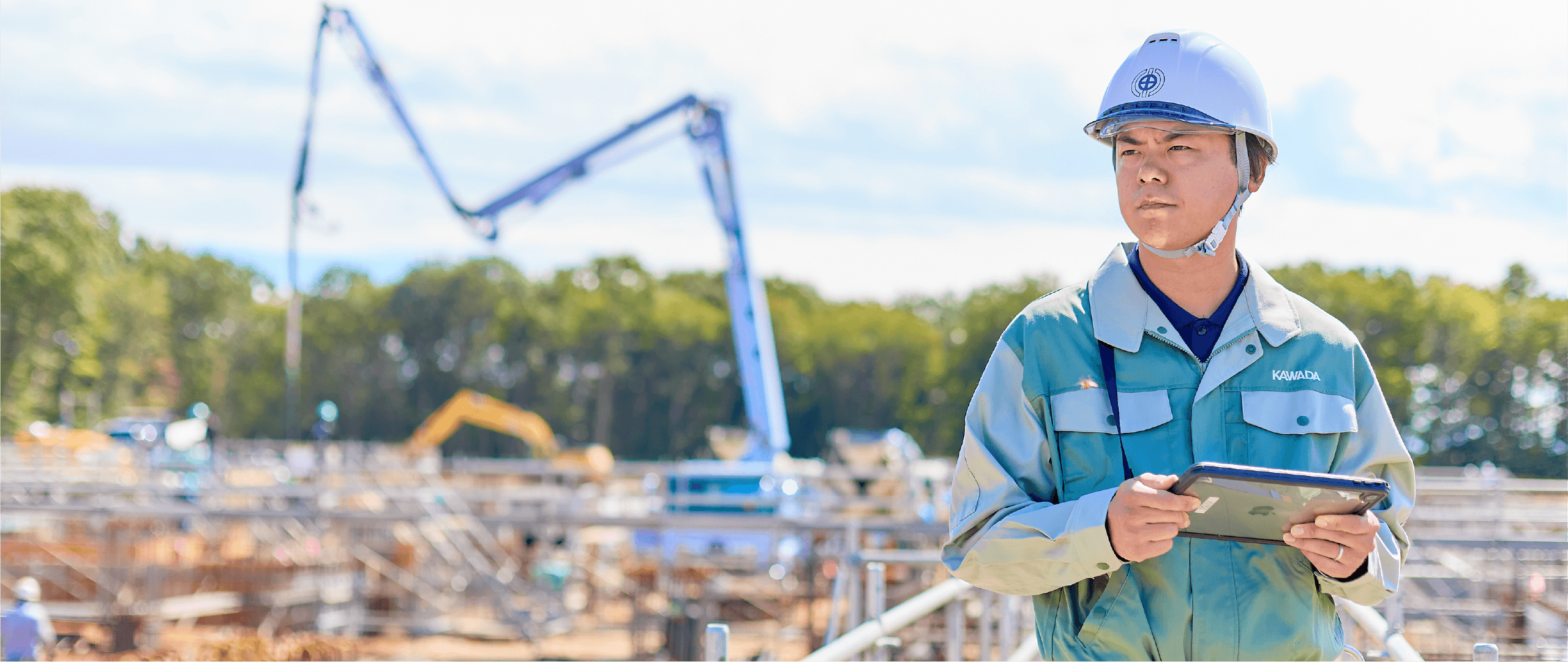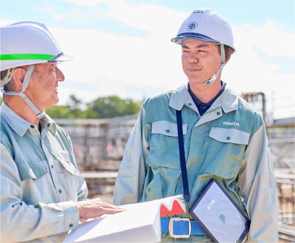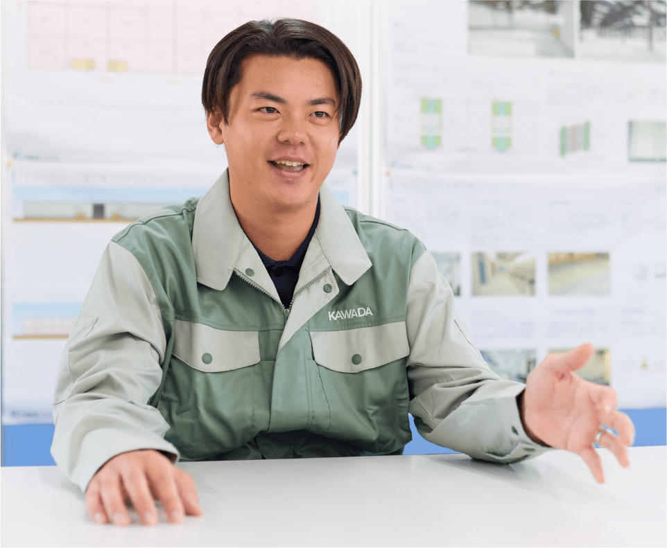 最初に担当したのは6〜7億円規模の倉庫プロジェクト。狭い敷地内に複数の倉庫を建設するという、非常に難易度の高いプロジェクトであり、会社が求める技術力や安全管理の水準も非常に高かったため、最初は苦労しました。また経験者として入社したこともあり、無理をして良く思われようとした部分もありました。しかし当社の特徴として、新卒も中途も関係なく一人の人間として接してもらえる風土があります。だからこそ分からないことは素直に質問したり、事務処理をサポートしてくれる部門の力を借りたりしながら、一歩ずつ着実に成長することができました。川田工業で働くようになってから、技術面はもちろん精神的な面や考え方など幅広い面で成長を実感しています。