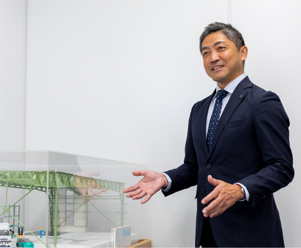 大学の機械科を卒業したのち、当社へ入社。物流倉庫や配送センター向けのシステム建築営業を約10年間経験しました。システム建築とは、高品質や低コスト、短工期を実現するために部材や設計が標準化された建築工法のこと。そのメリットを紹介しながら、お客さまの現状やニーズにどう適合させていくかを検討したり提案したりすることが主なミッションでした。その後、知見を広げたいと重機械メーカーへ転職し、営業職を十数年経験したのち、かつての同期からの誘いもあって再び当社へ入社。顧客の新規開拓などを担ったのち、2022年から営業企画室室長として予算設定や進捗の管理、協力会社の管理、新しい営業手法や新規事業の開拓などを広く担当しています。